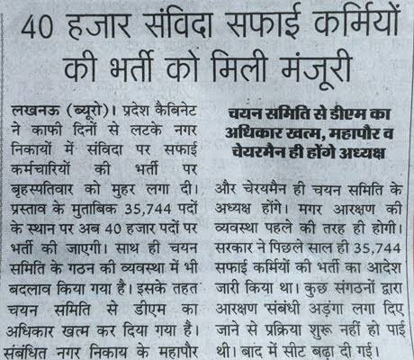 नगर निगम बोर्ड के माध्यम से यूपी सफाई कर्मी भर्ती हेतु 40 हजार रिक्त पदों की सूचना जारी की गयी है।